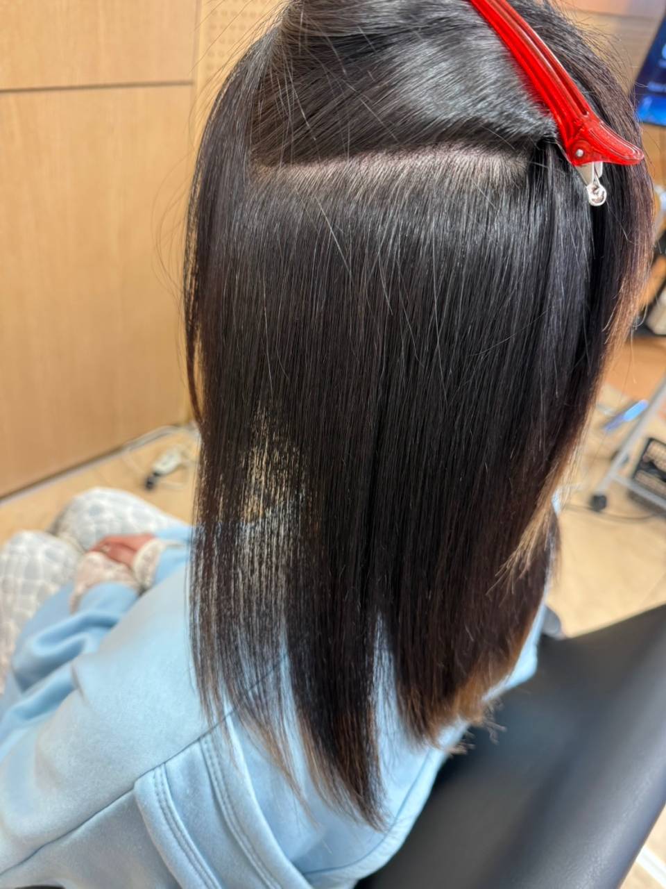 うねりは少なかったですが、細毛、切れ毛、毛先ブリーチ毛でなかなか、難易度高めのモデルさんです(T_T)