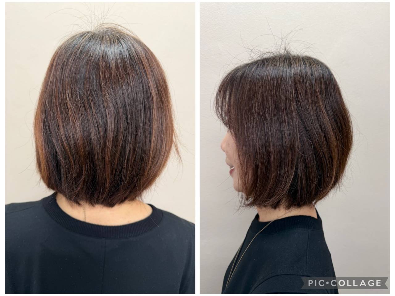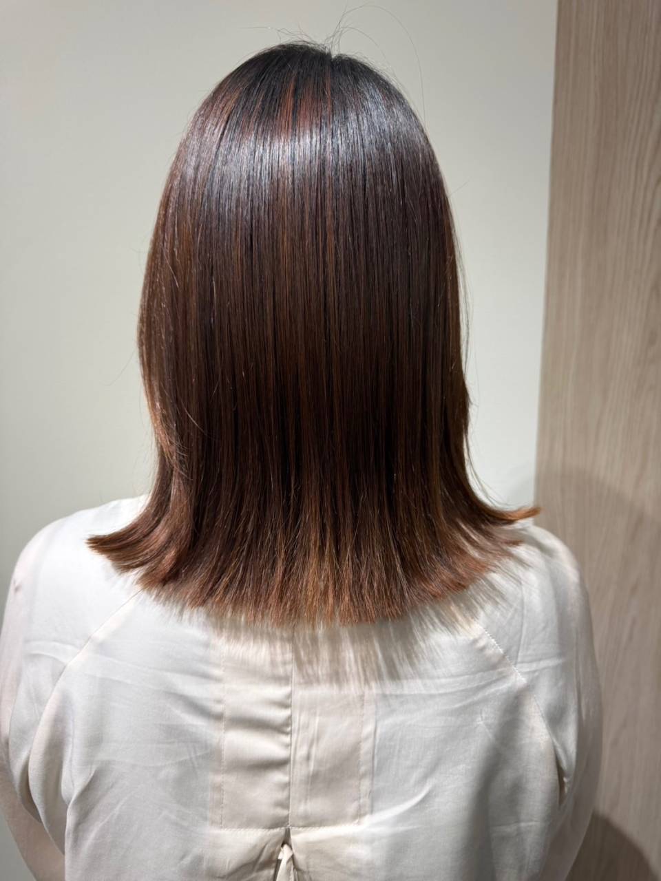 お二人目のモデルさんは難易度はそんなに高くない髪質のモデルさんで簡単ネオメテオストレートみたいな、髪の表面のみのストレート&カット&カラーです。